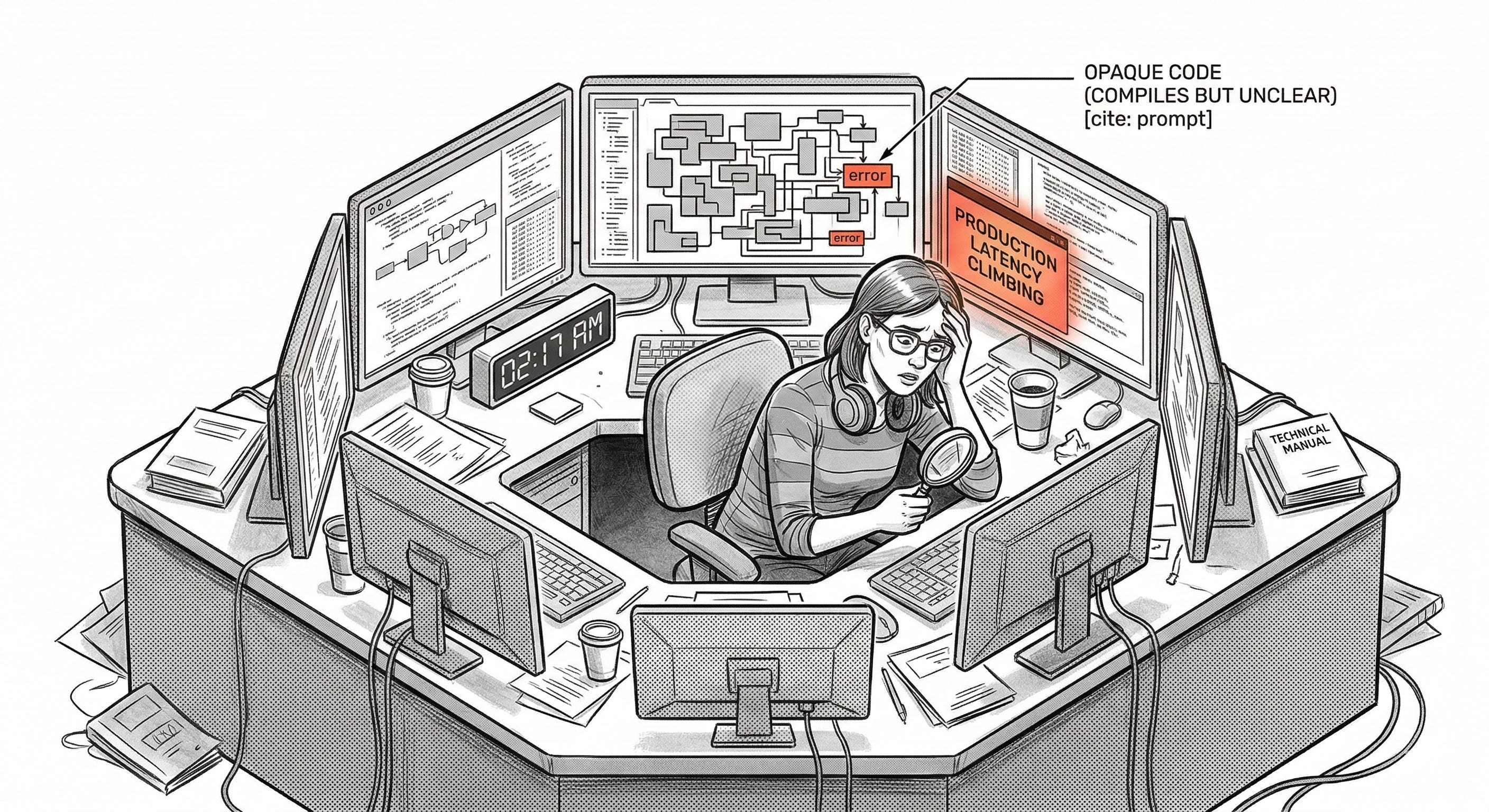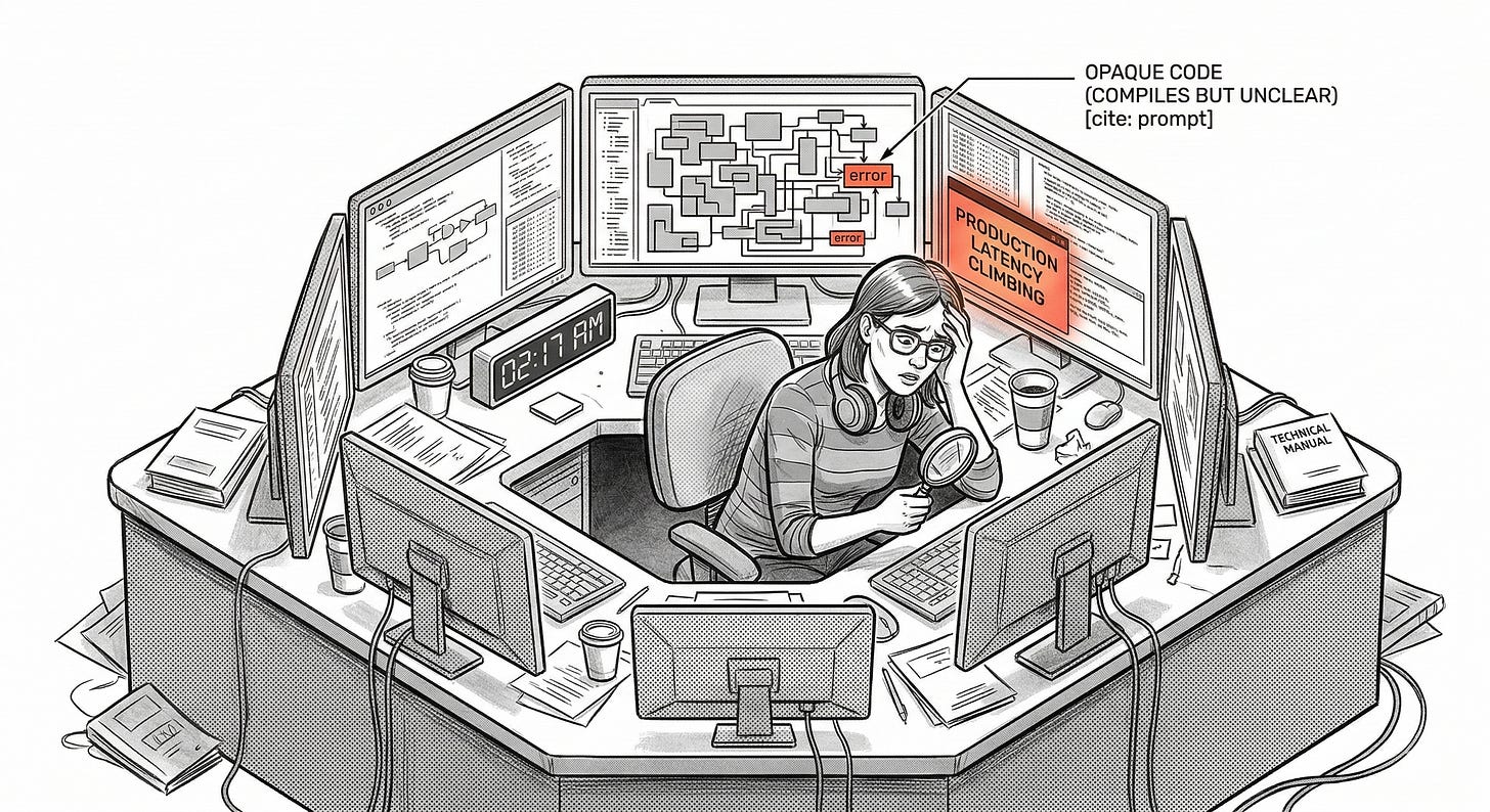 That matters in software because the skills needed at 2:17 AM during an incident are not built by approving outputs passively. They are built by wrestling with systems, debugging real failures, and forming mental models through repeated exposure. If a team generates more and understands less, then the hardest moment arrives exactly when its operational intuition is weakest.