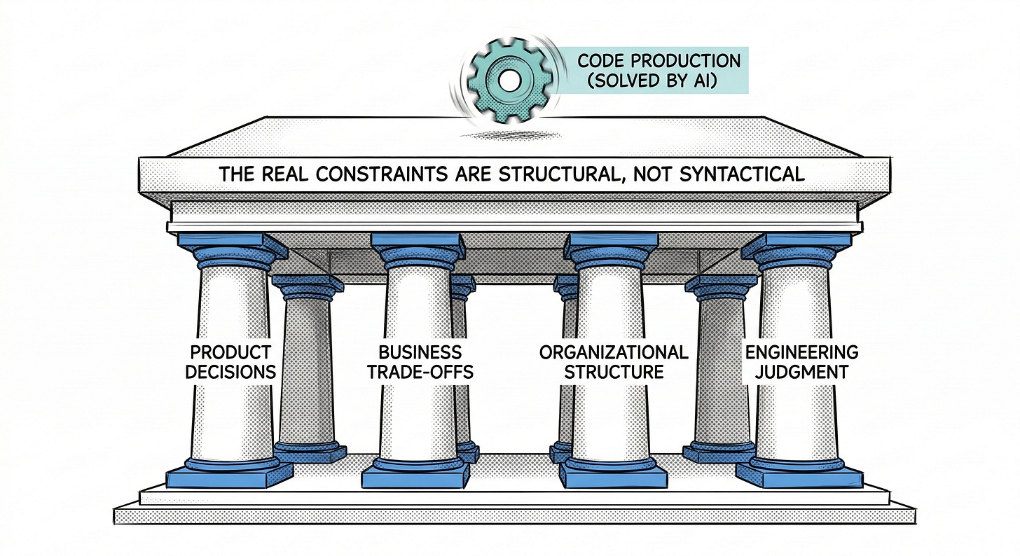 The real constraints in software development are product decisions, business trade-offs, organizational structure. Accelerating code production does not remove them. It exposes them.
